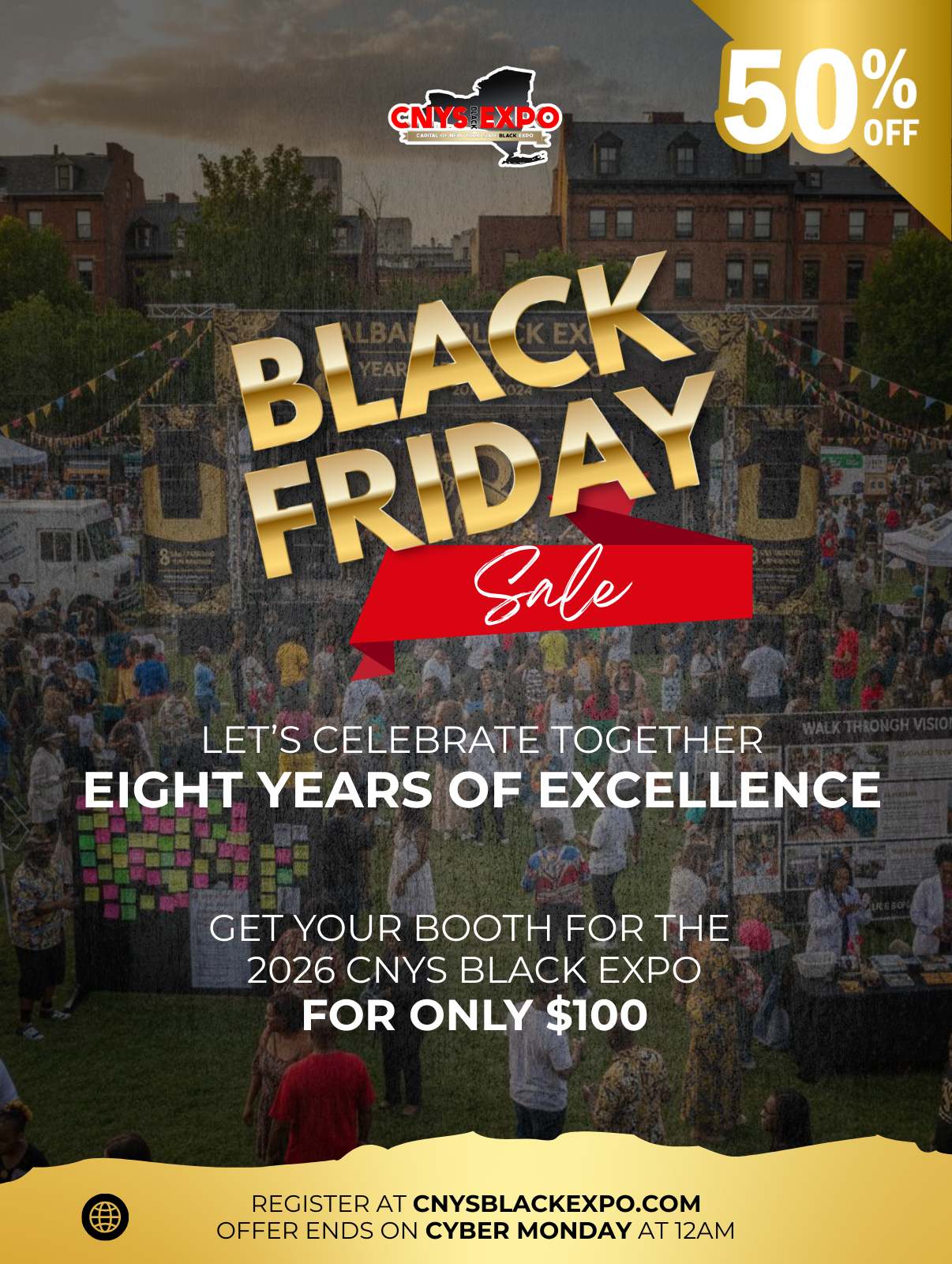 Celebrate eight years of excellence at the CNYS Black Expo! Our exclusive Black Friday Sale lets you secure your booth for the 2026 Expo for only $100. This limited-time offer is your chance to showcase your brand, connect with thousands of attendees, and be part of one of the region’s most vibrant community events. Don’t miss out—reserve your spot before the deal ends on Cyber Monday at 12 AM.